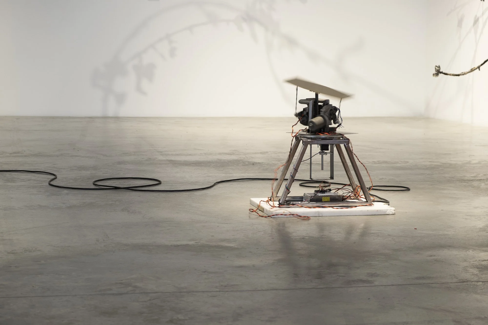 "Norton abstracts animal motion into mechanical locomotion in both a rowdy whir: or the perpetual ride (consolation prize for holding on) and drought of desire (show pony). The animal is notably absent in these kinetic sculptures that recall the bucking of a mechanical bull, the forward movement of a horse hoof, and the flicking of a tail. Other vestiges of the mammal include motifs of trophies and blue ribbons that gesture to an innately human prize culture. Instead of bodily warmth, there is a cold whir of mechanics, violently shaking or calculatingly manipulative. Norton considers what is left in the void of the body, as these motorized, self-propelling objects are never laid to rest, constantly performing." - Sarah Cho