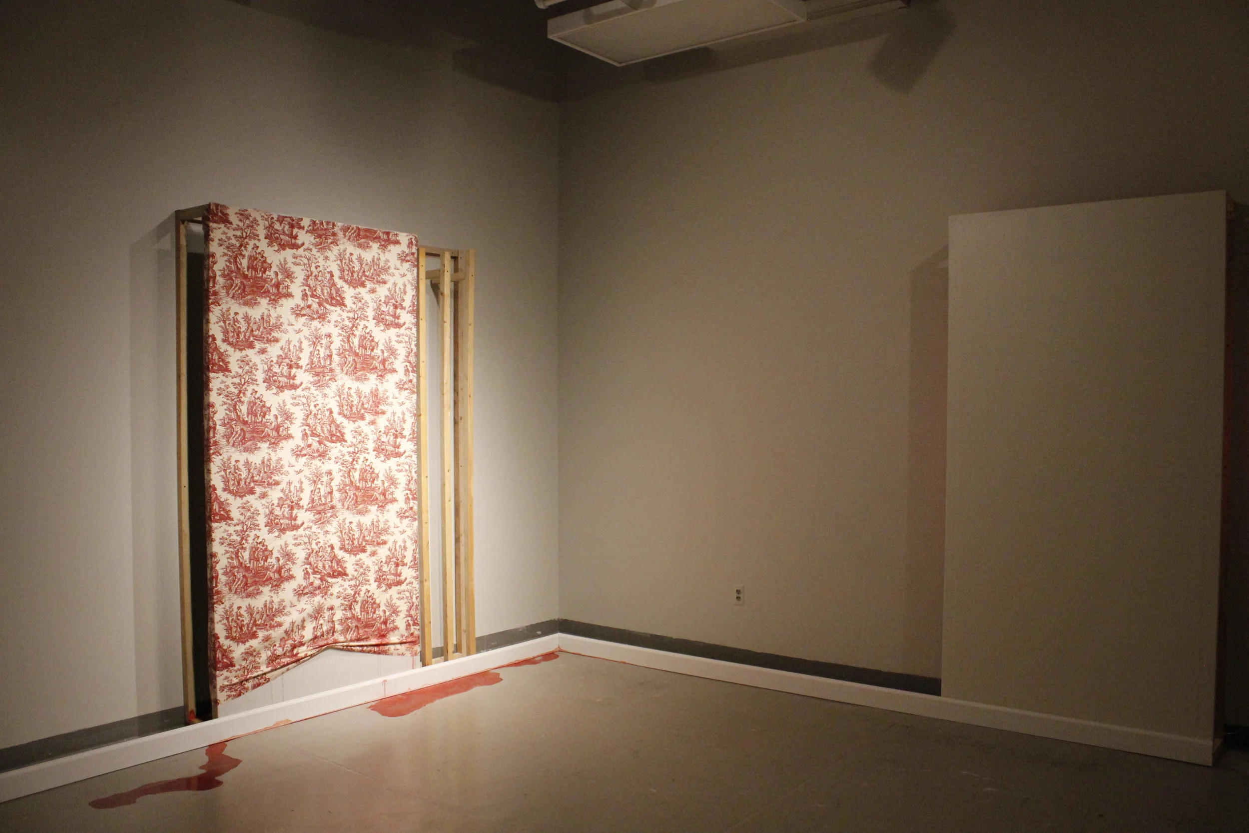 wall panels, wood, light, fabric, mysterious red liquid